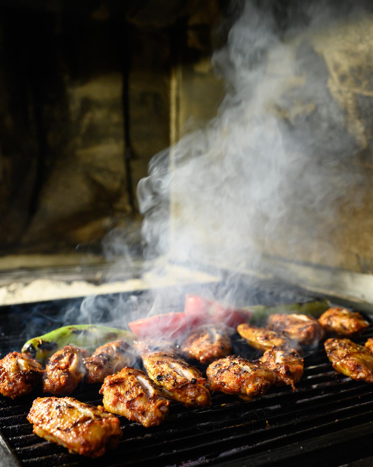 340gr. özel hazırlanmış soslu 8 adet tavuk kanat, pirinç pilavı, patates püresi, közde pişirilmiş domates, közlenmiş biber, köri sosu ile