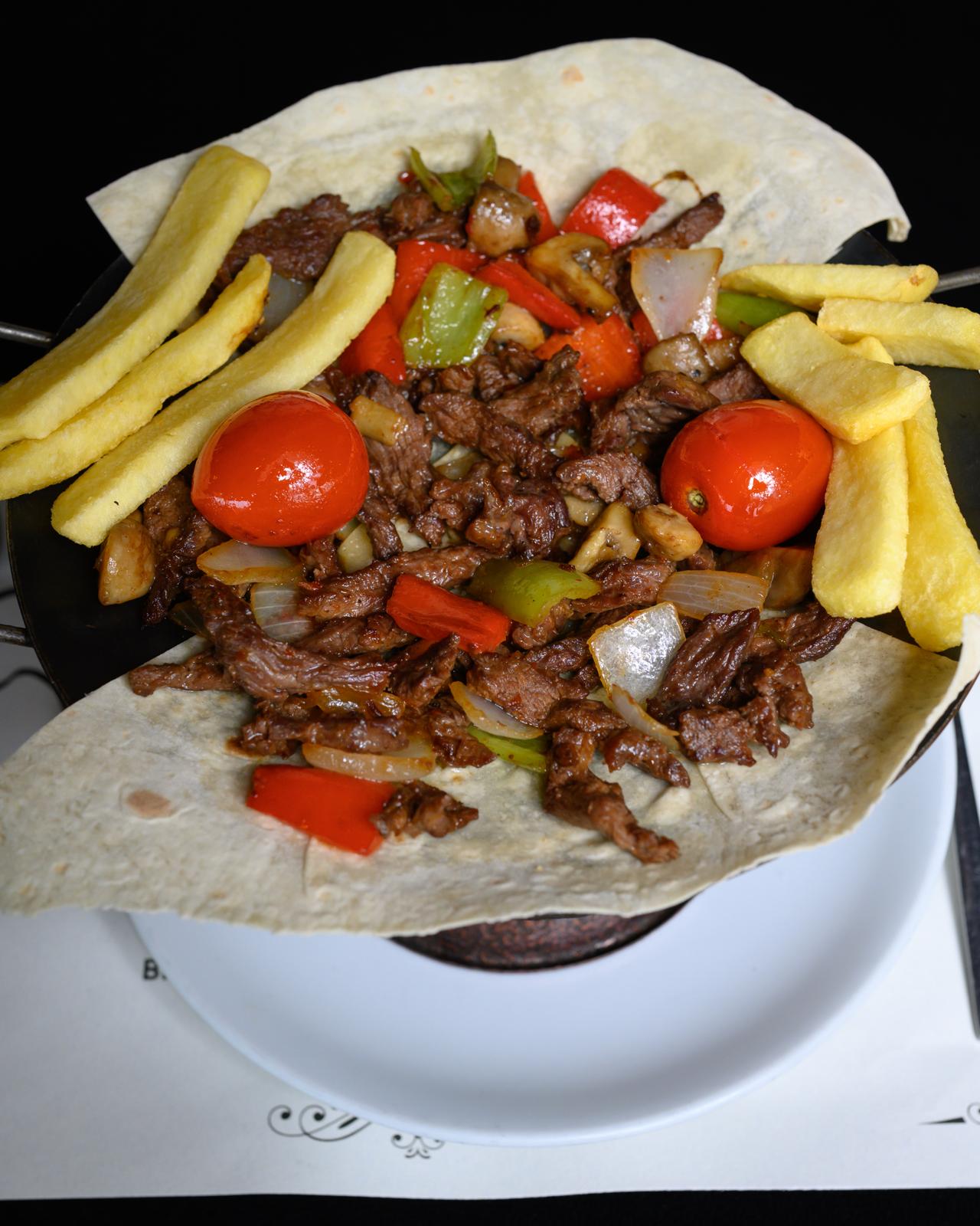 180-200 gr. özel marine edilip julyen doğranmış dana antrikot, mantar, kapya biber, soğan, sarımsak, yeşil biber ile sac tavada kavrularak hazırlanıp sıcak servisle sunum yapılır.